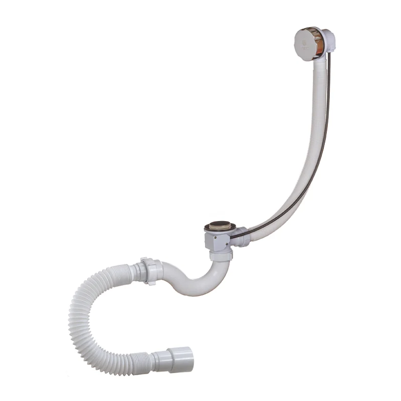 Сифон 1 1/2"х40, с полуавтоматическим сливом (нержавеющая сталь)-переливом (пластик-хром), для ванн и глубоких душевых поддонов. Конструкция сифона S-образная, прямоточная, самоочищающаяся. Отвод в канализацию гибкая труба 40-40/50.