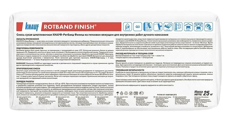 Ротбанд финиш – шпаклевка, состоит из гипса и полимерных добавок. Применяется для внутренних ремонтных работ, для стен, потолков и под декоративную штукатурку. Благодаря своему составу шпаклевка пластичная, легка в нанесении и не образует трещин. Создает идеально гладкое покрытие.
