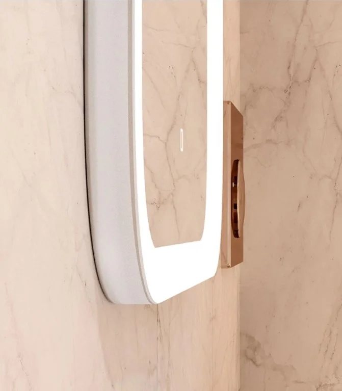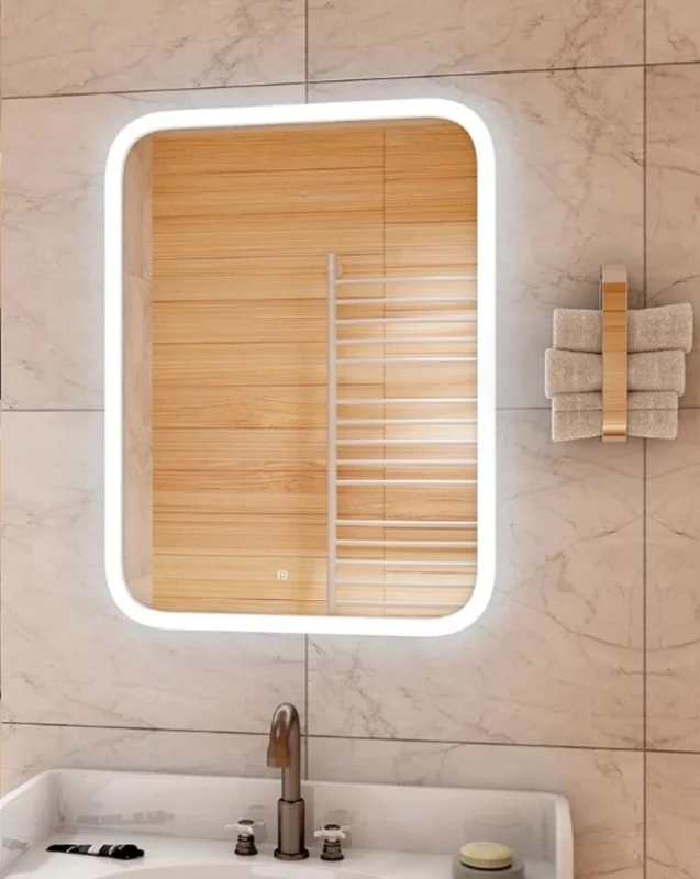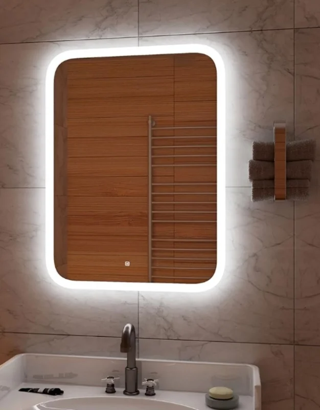 Модель обладает современным дизайном и удобным сенсорным управлением яркостью подсветки, расположенным в нижней части зеркала. При изготовлении используется светодиодная лента с плотностью диодов 120 шт./м и мощностью 9,6Вт/м, создающая мягкое и равномерное свечение по периметру зеркала. Подсветка рассчитана на 50 000 часов работы в непрерывном режиме.