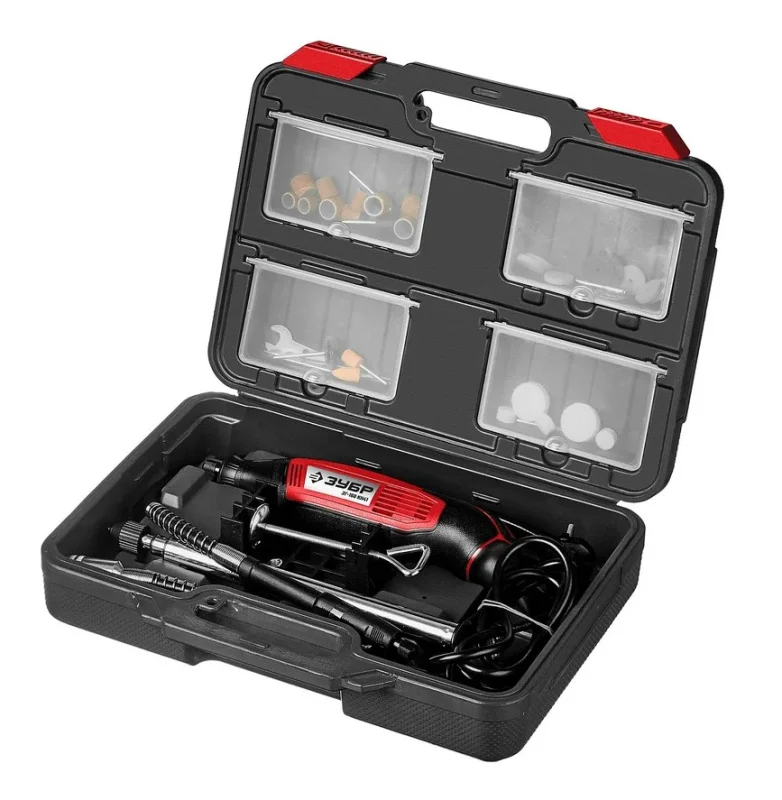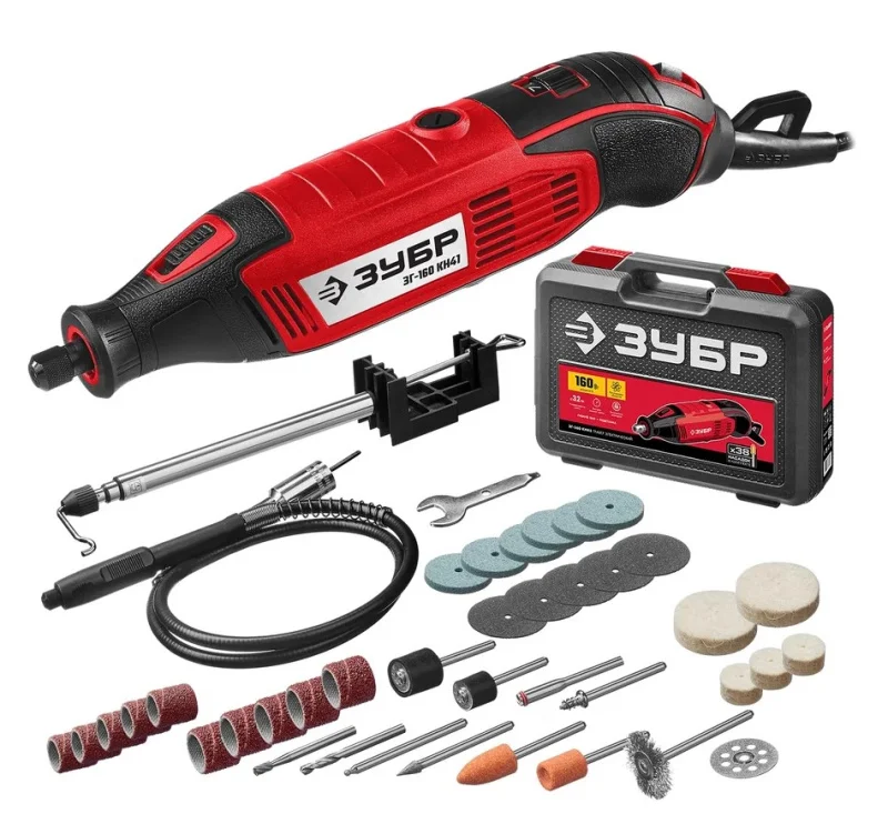 Электрический гравер ЗУБР 41 предмет, кейс ЗГ-160 КН41 помогает шлифовать, полировать, сверлить, фрезеровать и гравировать поверхности из дерева, стали, камня, плитки и т.д. Идеален для творческих работ, обработки мелких элементов и работы в труднодоступных местах