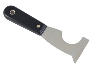 Шпатель-скребок РемоКолор 12-0-500 универсальный инструмент, используемый для нанесения отделочных материалов и их удаления. Большое полукруглое отверстие на лезвии позволяет легко счищать засохшую краску с малярного валика, труб и труднодоступных поверхностей. С помощью инструмента с выступающим уголком удобно удалять слой краски, старые обои, побелку, шпаклевку.