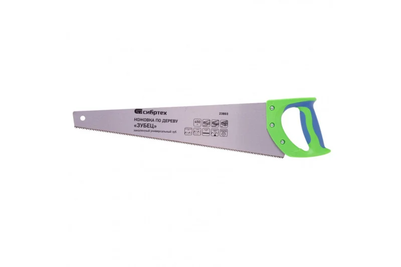 Ножовка по дереву 450 мм СИБРТЕХ Зубец 23803 - надежный ручной инструмент. Рабочая часть изготовлена из легированной стали, а зубья закалены, что обеспечивает продолжительный срок эксплуатации.