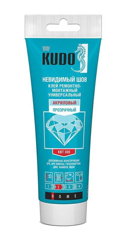 Клей KUDO Невидимый шов обладает устойчивостью к ультрафиолетовому излучению и воздействию моющих средств, он изготавливается на акриловой основе. Клей отличается повышенной адгезией к бетону, кирпичу, гипсокартону и другим строительным материалам, он не вызывает коррозии и имеет широкий температурный диапазон. Гарантирует после высыхания прозрачную пленку с высокой прочностью и эластичностью.