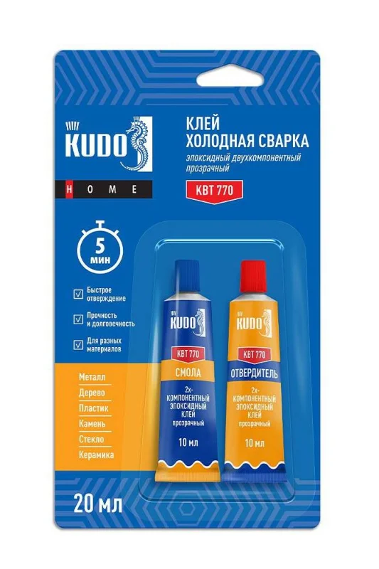 KUDO HOME эпоксидный двухкомпонентный клей, пригоден для дальнейшей обработки, включая сверление, шлифование и окраску. Он обеспечивает сцепление, стойкое к действию щелочей и кислот, быстро твердеет и образует прочное водонепроницаемое соединение. Отлично подходит для склеивания металла, дерева, пластика, камня, стекла и других материалов. Простой в нанесении, облегчает и уменьшает время монтажа.