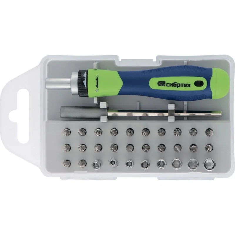 Реверсивная отвертка для точных работ с набором бит и торцевых головок СИБРТЕХ 32 предмета 13370 используется для обслуживания и ремонта мобильных телефонов, электронных приборов, часов и прочей мелкой электроники. Набор состоит из реверсивной рукоятки, удлинителя, торцевых головок и бит с различными шлицами. Материал - хромованадиевой сталь. Рукоятка выполнена из двухкомпонентного материала.