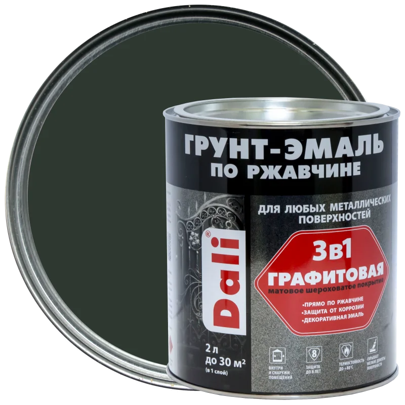 Грунт эмаль по ржавчине 3в1 Dali специально разработанная для металлических поверхностей, страдающих от ржавчины. Эмаль комбинирует в себе свойства преобразователя ржавчины, антикоррозионного грунта и декоративной эмали, обеспечивая трехступенчатую систему защиты. Барьерная, антикоррозионная и протекторная ступени гарантируют надежную защиту поверхности, при этом позволяя наносить на ржавчину. Благодаря повышенной адгезии к новым, ранее окрашенным и пораженным коррозией поверхностям, она формирует гладкое, долговечное и суперпрочное покрытие. Эта краска отличается рядом особенностей, которые делают ее незаменимой для различных проектов. Она устойчива к воздействию влаги, масел, слабых кислот и щелочей. Благодаря своей устойчивости к выгоранию, она не разрушится под воздействием УФ излучения.