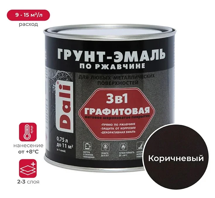 Грунт эмаль по ржавчине 3в1 Dali специально разработанная для металлических поверхностей, страдающих от ржавчины. Эмаль комбинирует в себе свойства преобразователя ржавчины, антикоррозионного грунта и декоративной эмали, обеспечивая трехступенчатую систему защиты. Барьерная, антикоррозионная и протекторная ступени гарантируют надежную защиту поверхности, при этом позволяя наносить на ржавчину. Благодаря повышенной адгезии к новым, ранее окрашенным и пораженным коррозией поверхностям, она формирует гладкое, долговечное и суперпрочное покрытие. Эта краска отличается рядом особенностей, которые делают ее незаменимой для различных проектов. Она устойчива к воздействию влаги, масел, слабых кислот и щелочей. Благодаря своей устойчивости к выгоранию, она не разрушится под воздействием УФ излучения.