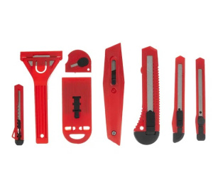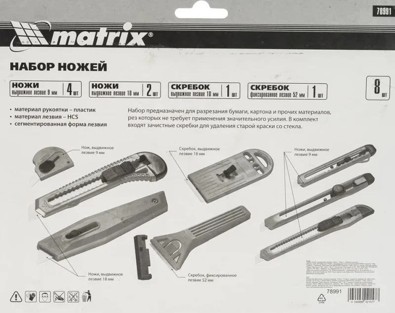Набор ножей с выдвижными лезвиями MATRIX 78991 предназначен для разрезания бумаги, картона и прочих материалов, для резания которых не требуется применение значительных усилий. Такой комплект содержит в себе ножи различного применения с пластмассовыми ручками. В комплект входят зачистные скребки для удаления старой краски со стекла.