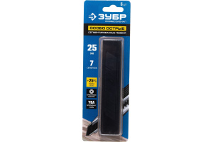 Вороненные лезвия ЭКСПЕРТ Зубр 09715-25-5 изготовлены из инструментальной стали У12А и являются расходным материалом для ножей. Лезвия проходят криогенную закалку, что делает режущую кромку более твердой и прочной. Оснастка поставляется в пластиковой упаковке, удобной для транспортировки и хранения. Двойная заточка обеспечивает сохранность лезвия острым в течение долгого времени. Можно резать различные материалы, например, ковровые покрытия, картон, линолеум и другие. Лезвие насчитывает 7 сегментов.