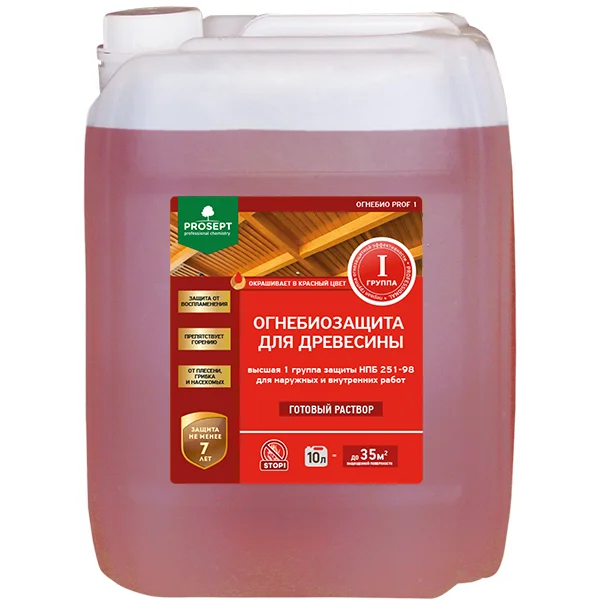 PROSEPT PROF является огнезащитной обработкой для деревянных конструкций, обеспечивающая их защиту от возгорания, гниения и биологических агентов. Подходит как для новых, так и обработанных огнезащитой деревянных конструкций. Устойчив к старению, не вызывает выщелачивания и высаливания.