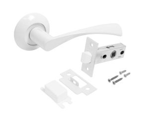 Комплект: ручка на круглой накладке и защелка без фиксации.Материал ручек — алюминиевый сплав, защелки - сталь. Покрытие - полимерная краска. Комплектуются винтовыми стяжками и шурупами. Длина разрезного квадрата - 95мм. Для деревянных дверей, толщиной 35-40 мм.