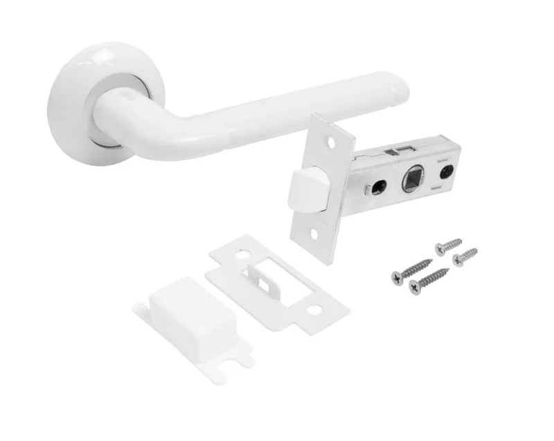 Комплект: ручка на круглой накладке и защелка без фиксации.Материал ручек — алюминиевый сплав, защелки - сталь. Покрытие - полимерная краска. Комплектуются винтовыми стяжками и шурупами. Длина разрезного квадрата - 95мм. Для деревянных дверей, толщиной 35-40 мм.