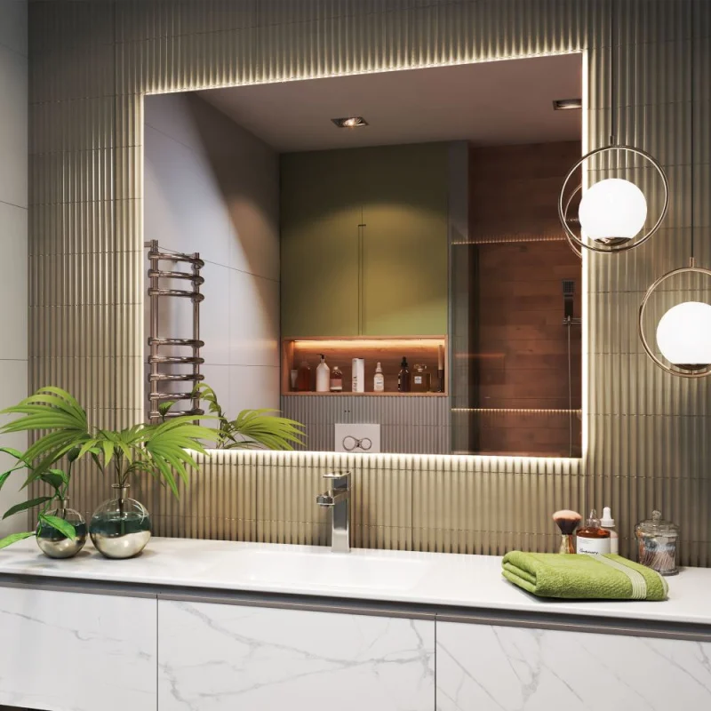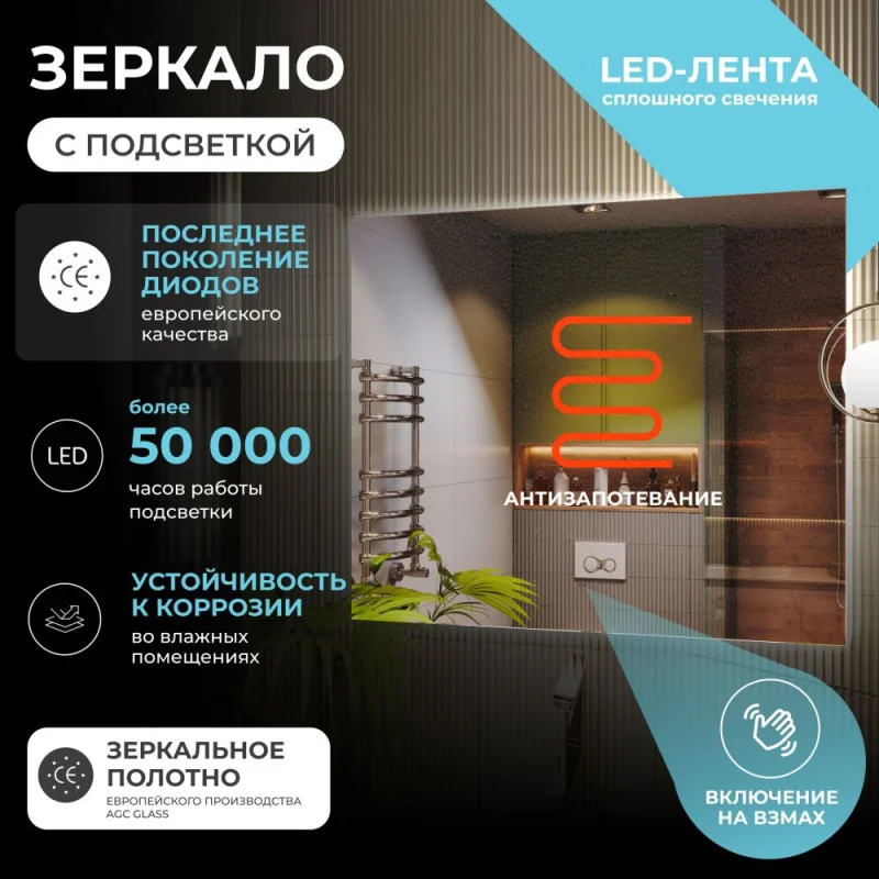 • Энергоэффективность: использование экономичных светодиодов способствует снижению потребления электроэнергии, что делает данное зеркало экологически безопасным выбором. Вы можете наслаждаться ярким освещением, не беспокоясь о больших расходах на электроэнергию.