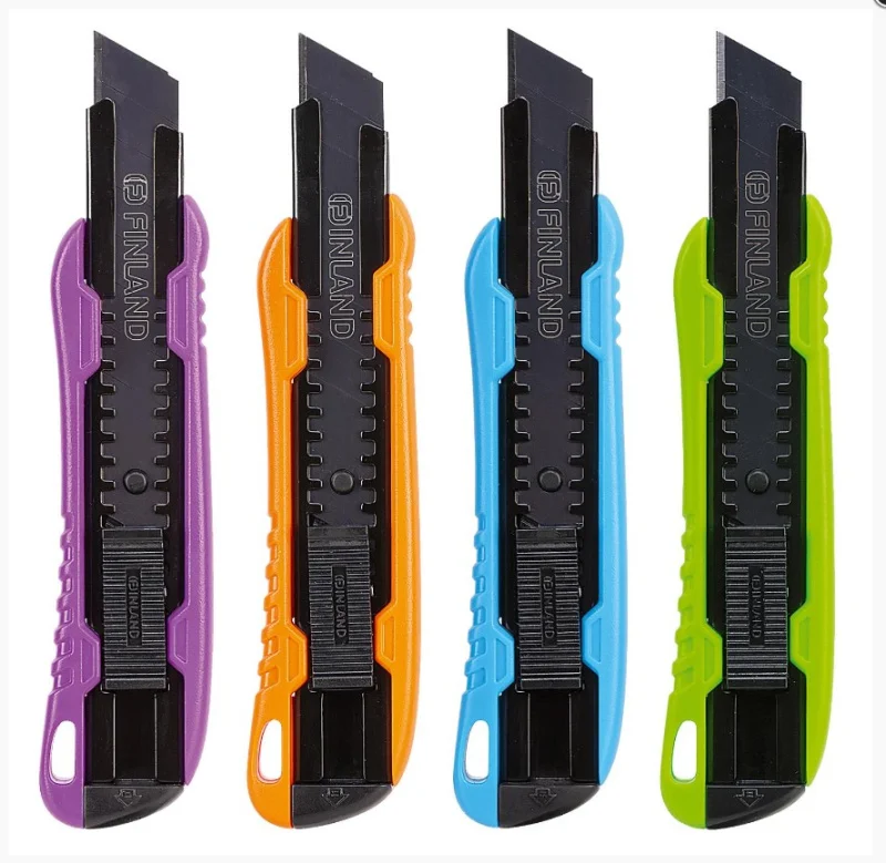 Пластмассовый нож с отламывающимся лезвием COLOR EXPERT 18мм 95620012 удобен в использовании. Направляющая выдвигает лезвие и фиксирует его в нужном положении. Сегментированное лезвие имеет риски для откола затупившегося сегмента.