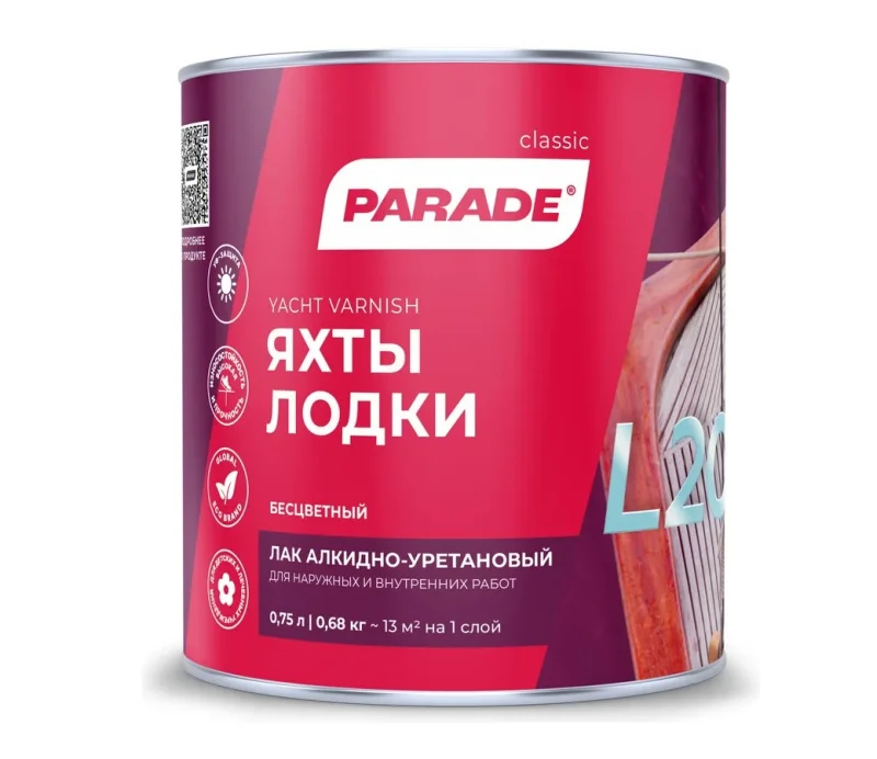 Лак яхтный алкидно-уретановый PARADE L20 Яхты & Лодки глянцевый 0,75 л - высококачественный однокомпонентный лак на алкидно-уретановой основе. Образует долговечное износостойкое покрытие с превосходными защитными свойствами и исключительной стойкостью к внешним условиям. Создает надежную защиту деревянным поверхностям, находящимся в неблагоприятных климатических условиях. Обладает прекрасной эластичностью и сопротивляемостью к ударам, морской воде, ультрафиолетовому излучению, влаге, перепадам температуры.