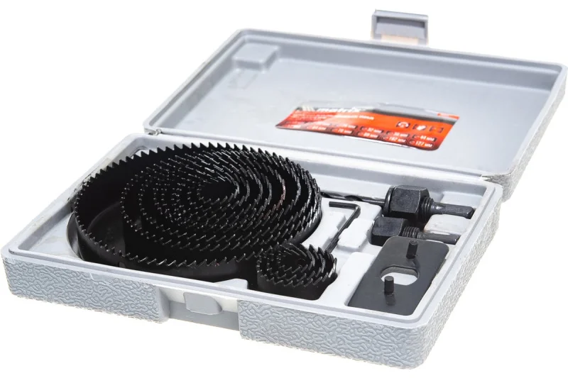 Набор кольцевых пил Matrix 70472 из 12 предметов предназначен для работы по дереву и включает коронки диаметром 19-127 мм. Они устанавливаются на электродрели и служат для выпиливания круглых отверстий в фанере, гипсокартоне, ДСП, ДВП и ламинате. Малая и большая державки облегчают установку пил разного диаметра. В комплекте имеется специальная проставка, исключающая проворот коронки во время сверления. Набор пригодится во время ремонта — с его помощью можно прорезать отверстия под розетки, выключатели, светильники и трубы.
