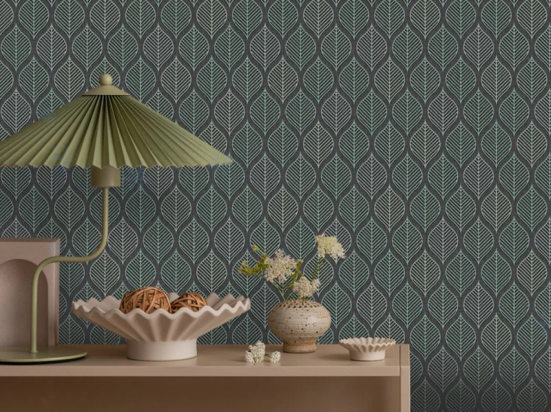 Зелёные оттенки обоев привнесут в интерьер природную свежесть и гармонию. Они прекрасно сочетаются с керамическими и терракотовыми элементами, создавая уютную атмосферу с использованием натуральных материалов. Геометрический узор на обоях добавит комнате динамичности и современного характера, а также может визуально изменить восприятие пропорций пространства.