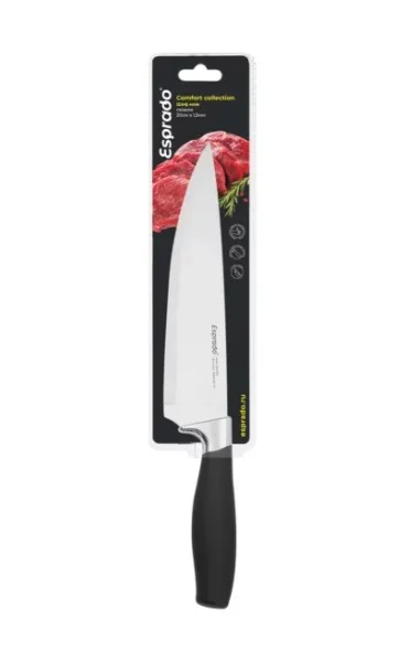 Шеф-нож 20 см. Толщина лезвия 1.5мм. длина лезвия 20см. . Материал- нерж.сталь 2Cr14. твердость лезвия по шкале Роквелла: 52-55 HRC. обработка лезвия: матовая полировка. ручка –черного цвета. Термопластичная резина + покрытие soft touch. лазерная гравировка логотипа на лезвии.