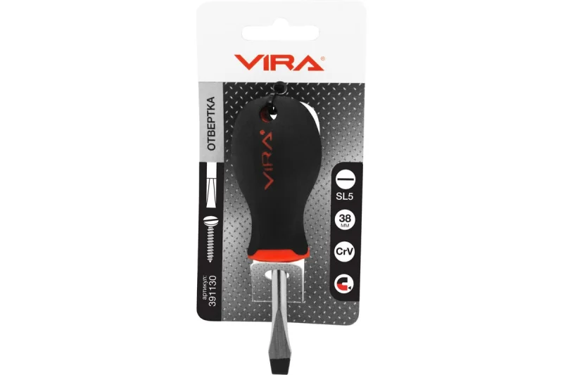 Отвертка RAGE by VIRA SL5x38. Отвертки RAGE by VIRA изготовлены из хром-ванадия. Твердость 48-52 HRC. Отвертка в два раза превосходит международный стандарт DIN по показателю предельного крутящего момента. Все отвертки серии имеют магнитный наконечник – мелкий крепеж, детали будет удобнее вворачивать или извлекать, сложнее потерять. Мы привели геометрию жала отвертки в соответствие с промышленным стандартом – оно без люфта помещается в шлице крепежа, благодаря точной обработке углов наконечника. Работая нашей отверткой, Вы не только сбережете шлиц шурупа, но и надолго сохраните сам инструмент, снизите усилия на вращение. Отверстие в рукоятке можно использовать для подвешивания отвертки на стенде, а можно вставить в него вороток для дополнительного усиления крутящего момента. Мы называем рукоятку отвертки RAGE by VIRA анатомической, потому что она имеет сглаженную трехгранную форму, которая удобно обхватывается рукой, а большой палец естественным образом вкладывается в одно из углублений. Все перечисленные особенности ручки дают возможность создавать больший крутящий момент при меньших усилиях с вашей стороны. Рукоятки отверток выполнены из прочного пластика и упругой резины TPR. Такое сочетание материалов делает ручку крепкой, но мягкой для вашей ладони. Никаких царапающих швов и резких граней. Резиновое покрытие обладает антискользящим эффектом. Размер шлица: SL5, длина стержня 38 мм. Короткий стержень полезен для работы в маленьких пространствах, внутри механизмов.