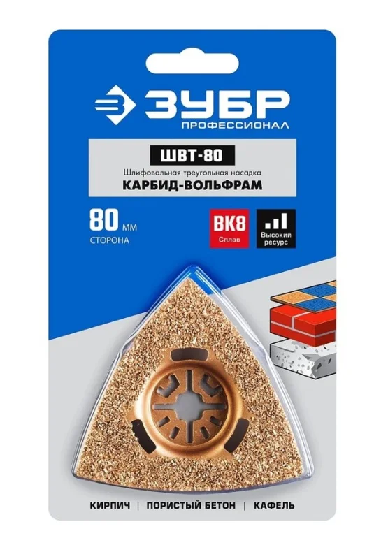 Насадка шлифовальная треугольная ЗУБР 15563-80, предназначена для обработки кирпича, пористого бетона, кафеля. Насадка изготовлена из высококачественной инструментальной стали с покрытием из карбида вольфрама марки ВК-8 на автоматизированных производственных линиях с применением новейших методов напыления твердосплавного зерна.
