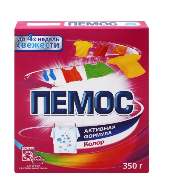 Порошок стиральный ПЕМОС Колор ‒ стиральный порошок с эффективной формулой, которая отлично отстирывает различные загрязнения. Проникая между волокнами ткани, он растворяет и удаляет грязь, а содержащийся в его формуле специальный компонент сохраняет цвета яркими. С помощью всего лишь одной пачки ПЕМОС 350г можно отстирать более 50 вещей. ПЕМОС ‒ стирает много, стоит недорого!
