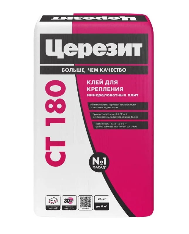 Сухая клеевая строительная смесь Ceresit CT 180 (Церезит CT 180) разработана специально для крепления плит из минеральной ваты при теплоизоляции наружных стен здания.