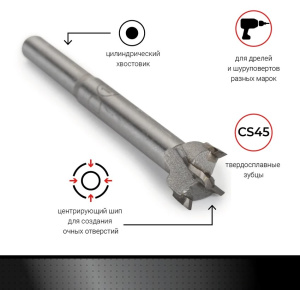 Основная область применения сверла форстнера, это сверления глухих отверстий в древесине, ЛДСП, фанере, пластике при установке мебельных врезных петель (лягушки), врезных замков, навесов, а также сквозных отверстий при проведении сантехнических работ, прокладке коммуникаций. Особенность сверла - наличие центрирующего острия, которое позволяет делать точные отверстия без предварительного накернения. Сверло изготовлено из высококачественной стали с твёрдосплавными карбидными зубцами. Цилиндрический хвостовик делает оснастку применимой ко всем видам ручного и электроинструмента оснащённых быстрозажимным патроном.