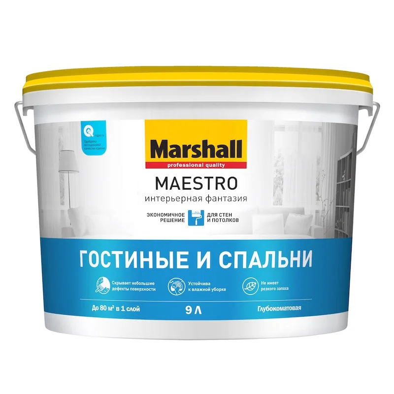 Marshall Maestro является глубокоматовой водно дисперсионой краской для внутренних стен и потолков с повышенной адгезией и укрывистостью. Она гарантирует покрытие, устойчивое к влажной уборке и без использования моющих средств, идеальна для нанесения на гипсокартон и обои под покраску. Эта краска отлично справляется с использованием в помещениях с умеренной влажностью и низкой эксплуатационной нагрузкой, таких как спальни, кабинеты, гостиные и гардеробные. Она также сертифицирована для использования в детских и лечебных учреждениях.