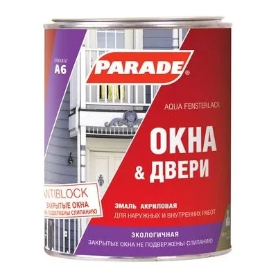 Эмаль PARADE А6 Окна & Двери для наружных и внутренних работ. Предназначена для окраски деревянных окон, дверей и других элементов подверженных плотному соприкосновению, а также прочих деревянных и минеральных поверхностей.