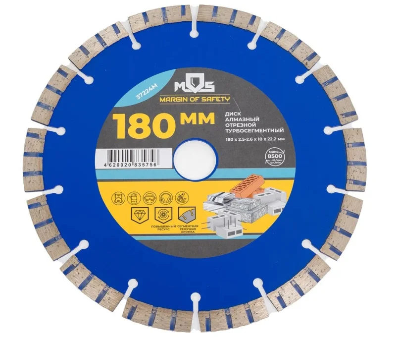 Турбосегментный. Для использования с УШМ. Посадочный диаметр 22,2 мм. Для «сухой» и «влажной» резки кирпича, бетона, армированного бетона, мрамора, гранита и других твердых материалов. Сегментная алмазная режущая кромка, с "турбо" профилем высотой 10 мм, увеличивает скорость реза и способствует более эффективному удалению отработанного материала, предотвращая перегрев диска. Материал: инструментальная сталь, режущая кромка - расплав с техническими алмазами. Упаковка: блистер.