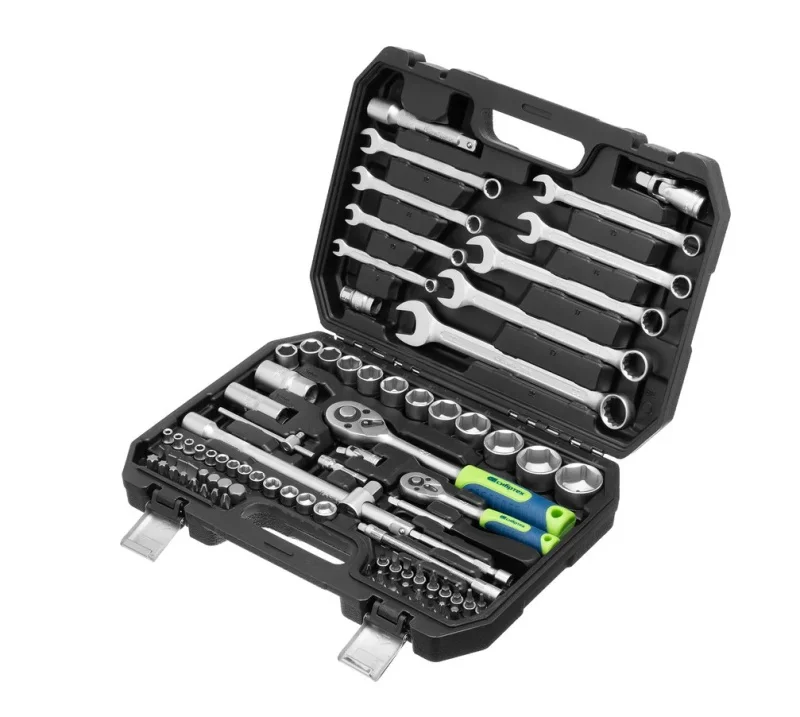 Набор инструментов Сибртех 13391 упакован в пластиковый кейс и состоит из 82 предметов с присоединительным размером 1/2"" и 1/4"", предназначенных для слесарных работ, преимущественно монтажа и демонтажа резьбового крепежа с разными типами шлицев. В комплект поставки входят карданы, удлинители и переходники, облегчающие работу в труднодоступных местах. Набор используется для ремонта автомобилей, а также полезен в быту.Преимущества Износостойкость — элементы набора изготовлены из высокопрочной стали. Надежная защита от коррозии — на инструменты нанесено матовое хромовое покрытие. Комфортная и эффективная работа — ключи-трещотки с 45 зубьями оснащены механизмом быстрого сброса, переключателем реверса с металлическим флажком и двухкомпонентной рукояткой. Прочная фиксация — шариковый замок на трещотках, воротках, шарнирах и удлинителях надежно удерживает головки. Удобное хранение и транспортировка — инструменты и насадки упакованы в ударопрочный пластиковый кейс с металлическими замками.