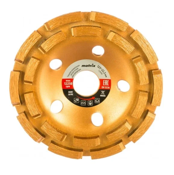 Двухрядная алмазная зачистная чашка Matrix 72990 диаметром 125 мм, с посадочным отверстием 22,2 мм, — оснастка для углошлифовальных машин, предназначенная для грубой обработки бетонных, каменных, кирпичных, мраморных и гранитных поверхностей. Позволяет осуществлять зачистку швов, стыков, неровностей, удаление наплывов. Придает поверхности шероховатость для улучшения ее адгезивной способности перед нанесением строительных растворов. Сегменты рабочей части расположены в 2 ряда, поэтому насадка обладает высокой производительностью и снимает толстый слой материала. Чашка предназначена для профессионального применения.