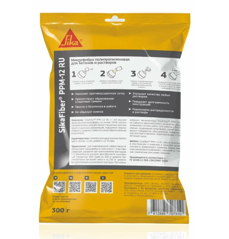 SikaFiber PPM-12 RU – это микросинтетическая фибра на основе 100% чистого полипропилена, разработанная специально для контроля усадочных деформаций, повышения морозостойкости, ударной стойкости и огнестойкости бетонов