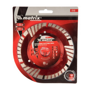 Алмазный отрезной сегментный диск Matrix 73153 с защитными секторами, диаметром 125 х 22,2 мм, применяется для сухой резки бетона разной прочности, камня, кирпича, шлакоблока и тротуарной плитки. Используется как оснастка для углошлифовальных машин с соответствующим посадочным диаметром. Диск изготовлен методом холодного прессования и выдерживает повышенные нагрузки при прохождении арматуры в слабоармированном железобетоне.Работа без подачи воды — сегментная структура рабочей части обеспечивает эффективное охлаждение и отвод пыли.Продуманная конструкция — защитные секторы предохраняют сегменты диска от преждевременного износа и налипания шлама.Уникальная форма — диск позволяет выполнять кратковременную обработку боковой поверхностью без риска поломки.Высокий ресурс — режущая часть содержит увеличенное количество алмазов, которые надежно удерживаются специально подобранной металлической связкой.Ширина рабочей части 7 мм — диск успешно справляется с бытовыми задачами.