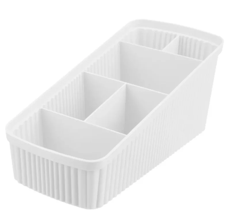 Органайзер для косметики из линейки Velvet от Econova позволит организовать хранение аксессуаров и косметических принадлежностей в ванной комнате или на туалетном столике. Органайзер имеет 6 отделений разной высоты и размеров и подходит для хранения косметики, гигиенических принадлежностей, кисточек для макияжа и др. Органайзер Velvet может использоваться для хранения канцтоваров на рабочем столе. Органайзер выполнен из прочного и долговечного полипропилена. Материал не боится влажности и перепадов температур, а также легко моется.