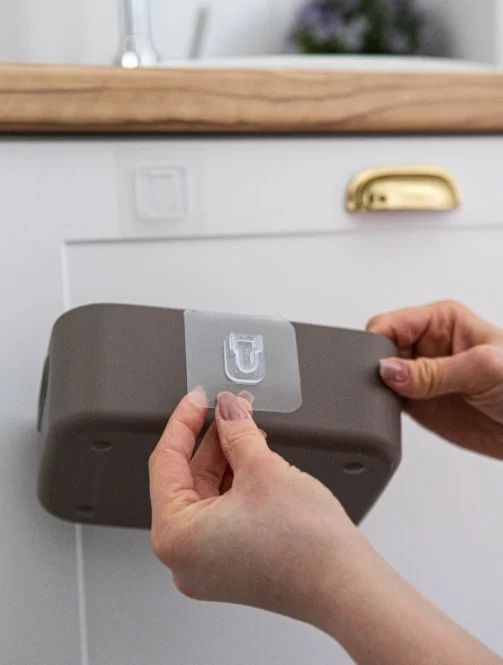 Установка такого держателя занимает буквально считанные секунды и не требует сверления стены. Самоклеющаяся фурнитура удобна ещё и тем, что её можно прикрепить непосредственно на плитку над ванной и повесить на неё мочалки, детские игрушки и различные мелочи.