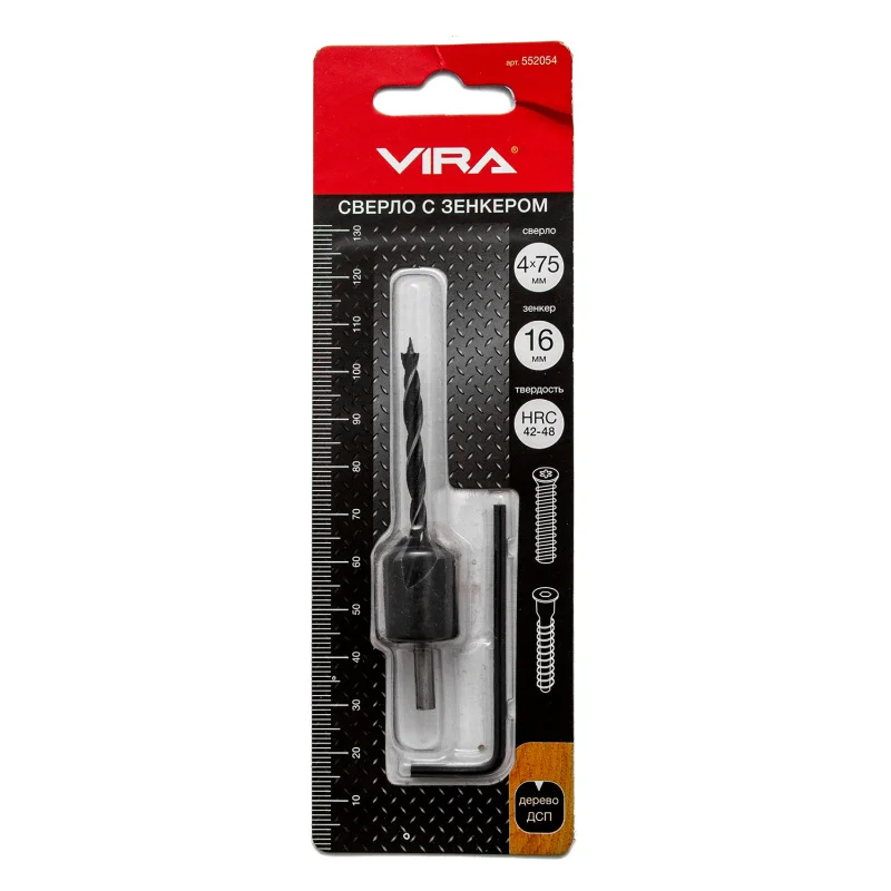 Сверло с зенкером 4 мм VIRA 552054 особо удобно в профессиональном применении, при необходимости создания большого количества отверстий и их подготовки под установку крепежа. Сверло-зенкер позволяет объединить две операции: изготовление непосредственно отверстия и обработки его кромки. Создаваемая фаска необходима для погружения головки используемых метизов в тело материала.