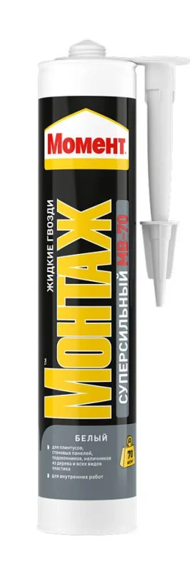 Момент Монтаж Суперсильный МВ 70 Белый клей с высокой начальной силой склеивания, подходит для различных ремонтных работ. Он склеивает широкий спектр материалов, включая дерево, металл, пластик и керамику. Белый цвет делает его идеальным для соединения элементов, где требуется незаметный шов. Клей обладает влагостойкостью, морозостойкостью и быстрым склеиванием, не содержит растворителей. Отлично подходит для установки стеновых панелей и декоративных элементов.