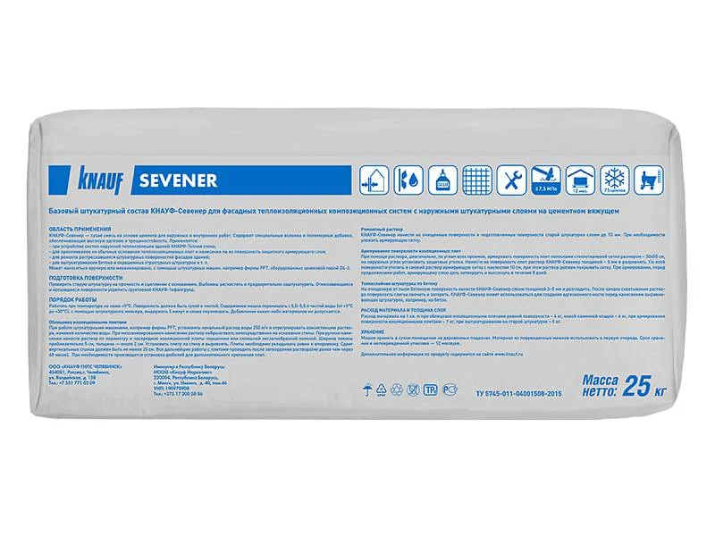 Knauf Севенер — сухая штукатурно-клеевая смесь на цементной основе, содержащая фракционированный песок, полимерные добавки и специальные волокна. Этот состав предназначен для выполнения широкого спектра работ в системах наружной теплоизоляции и ремонта фасадов.