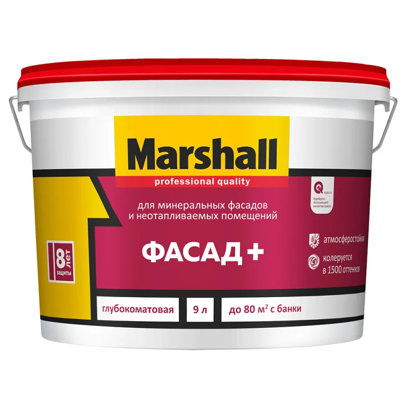 Marshall Фасад+ акриловая глубоко матовая краска для наружных и внутренних работ, образующая гладкое атмосферостойкое покрытие. Идеально подходит для окрашивания минеральных поверхностей, включая бетонные, оштукатуренные и кирпичные стены. Благодаря своим грязеотталкивающим свойствам, эта краска облегчает уход за поверхностью и защищает ее от износа. Она легко наносится и подходит для декорирования фактурных поверхностей и декоративных штукатурок. Эта краска рекомендована для окраски фасадов зданий, а также для использования внутри помещений, включая неотапливаемые помещения.