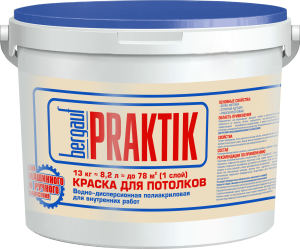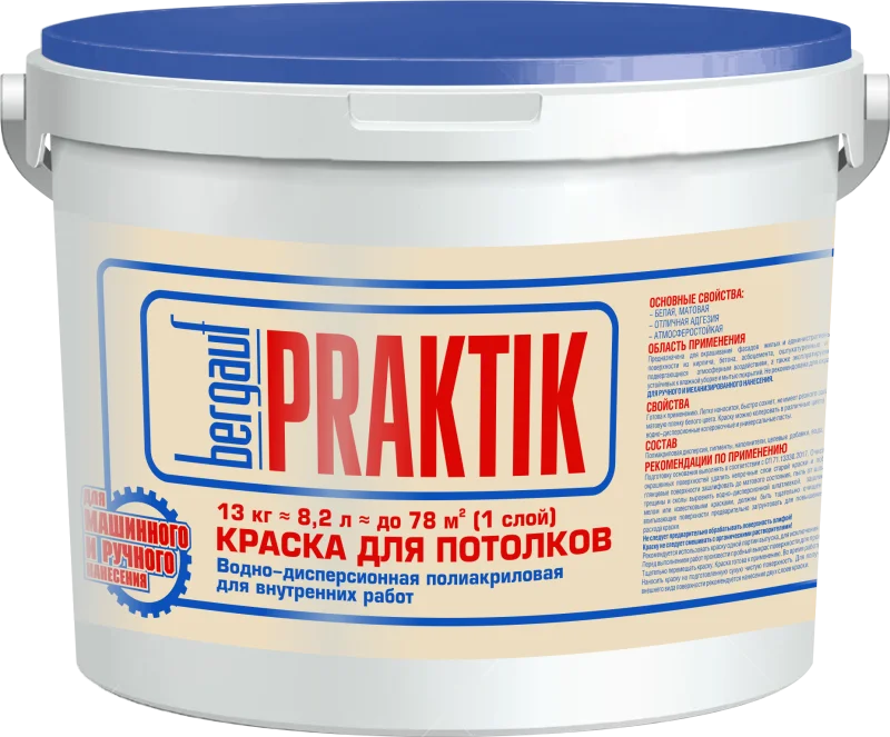 Краска Bergauf Praktic подходит для сухих помещений, гарантирует качественное равномерное окрашивание, не оставляет брызг и подтёков. Она укрывает за два слоя, придаёт эффект шелковистого полотна и визуально расширяет пространство. Быстросохнущая краска подходит как для ручного, так и для механизированного нанесения. Её структура маскирует мелкие неровности поверхности потолка, краска легко наносится, быстро сохнет и имеет нейтральный запах. После высыхания образуется ровное покрытие. Краску можно колеровать для получения различных цветов и оттенков.