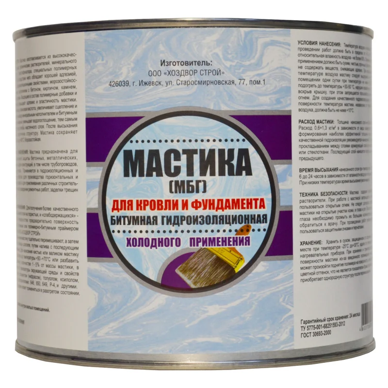 Мастика изготавливается из высокакачественных битумов, органических растворителей, специальных полимерных добавок и минерального наполнителя, вследствие чего обладает высокой теплостойкостью, адгезией и хорошими клеющими и гидроизоляционными свойствами.
