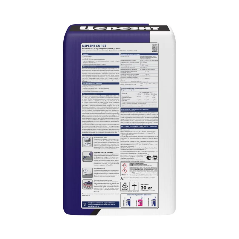 Самовыравнивающаяся смесь CN 173 предназначена для выравнивания бетонных, цементно-песчаных, ангидритных и гипсовых оснований пола под укладку керамических плиток, линолеума, ковролина, ламината и т.п. напольных покрытий, а также для изготовления и ремонта стяжек, связанных с основанием, в сухих помещениях с низкими механическими нагрузками (жилых, бытовых, административных и т.п.). Пригодна как для ручного, так и для механизированного нанесения. За один проход смесь можно наносить слоем толщиной от 6 до 60 мм.