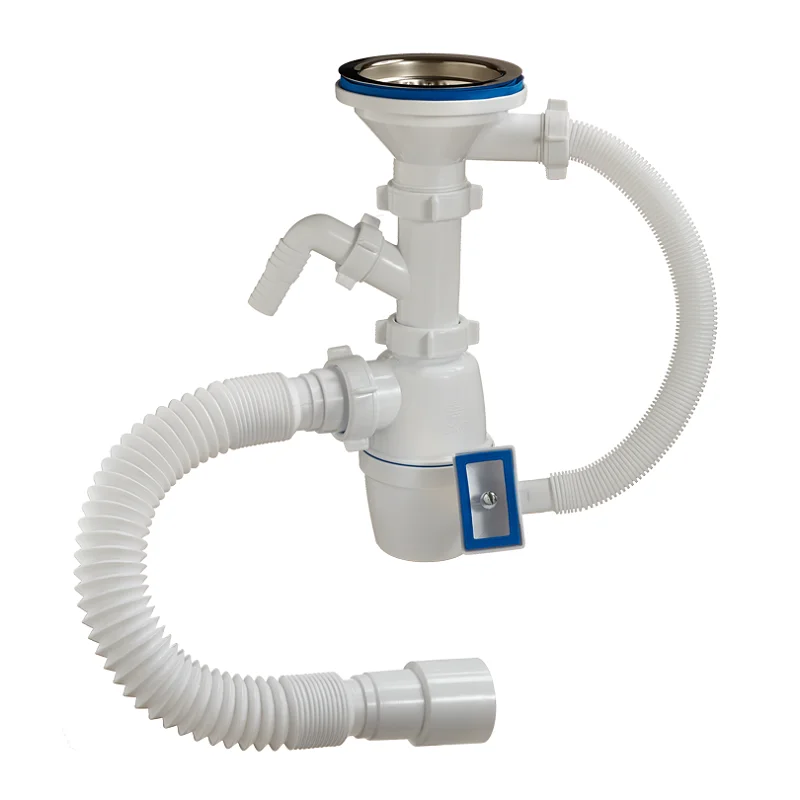 Сифон с большим корпусом и отстойником, выпуском с нержавеющей чашкой д.114мм, отводом для слива от стиральной машины и гибкой трубой 40-40/50, для мойки с прямоугольным переливом. В комплекте идут две прокладки на перелив – прямоугольная на квадратную форму мойки и полукруглая на круглую форму мойки.