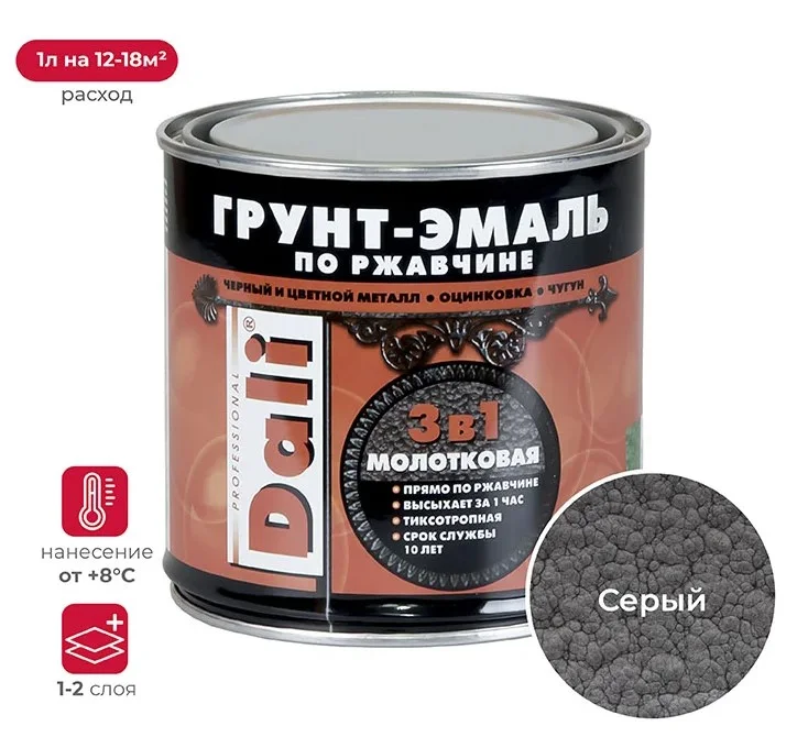 Грунт эмаль по ржавчине 3в1 Dali специально разработанная для металлических поверхностей, страдающих от ржавчины. Эмаль комбинирует в себе свойства преобразователя ржавчины, антикоррозионного грунта и декоративной эмали, обеспечивая трехступенчатую систему защиты. Барьерная, антикоррозионная и протекторная ступени гарантируют надежную защиту поверхности, при этом позволяя наносить на ржавчину. Благодаря повышенной адгезии к новым, ранее окрашенным и пораженным коррозией поверхностям, она формирует гладкое, долговечное и суперпрочное покрытие. Эта краска отличается рядом особенностей, которые делают ее незаменимой для различных проектов. Она устойчива к воздействию влаги, масел, слабых кислот и щелочей. Благодаря своей устойчивости к выгоранию, она не разрушится под воздействием УФ излучения.