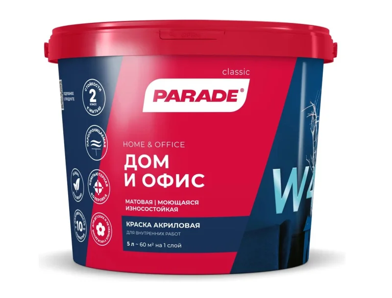 PARADE W4 дом и офис является акриловой матовой водно дисперсионой краской для стен и потолков внутри помещений. Создает прочное, матовое паропроницаемое покрытие, которое выдерживает частое мытье. Имеет отличные декоративные свойства и укрывистость. Сертифицирован для использования в детских и медицинских учреждениях, может быть заколерован с помощью компьютерной колеровки по системе Parade или с использованием водных красителей. Обеспечивает долговечность и эстетичность интерьерного покрытия