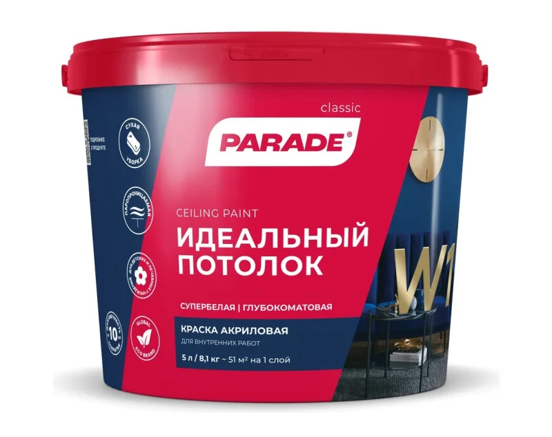 Краска акриловая белая матовая PARADE W1 Идеальный потолок 5 л обладает отличной укрывистостью.