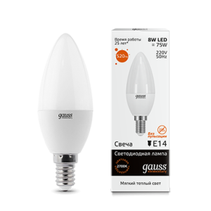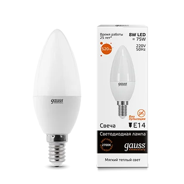 Светодиодные лампы GAUSS Elementary Candle выполнены в дизайне, имитирующем свечу. Эти лампы идеально подходят как для жилых, так и для коммерческих пространств. Они прекрасно смотрятся в светильниках без абажуров, а также в люстрах и настенных светильниках. Разнообразие цветовых температур и мощностей ламп позволяет создать уютную или рабочую атмосферу. Их однородное свечение обеспечивает визуальный комфорт в любом помещении. Светодиодные лампы GAUSS гарантируют надежную работу на протяжении всего срока эксплуатации.