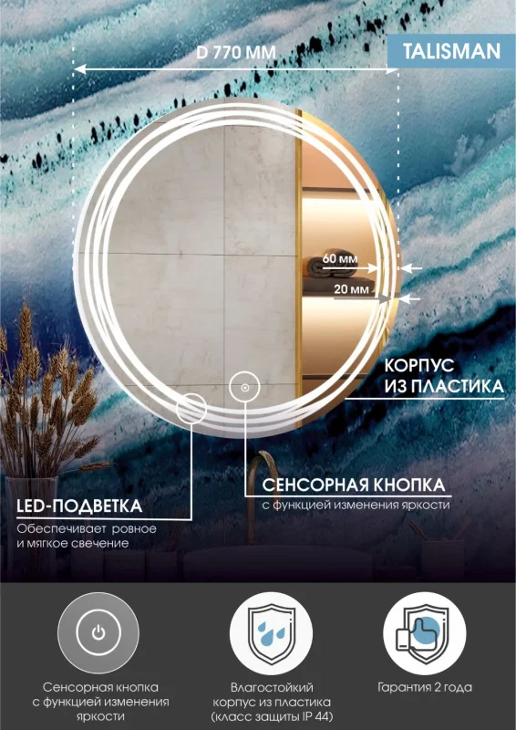 В подсветке используется светодиодная лента с классом защиты IP-44 для помещений с повышенной влажностью.