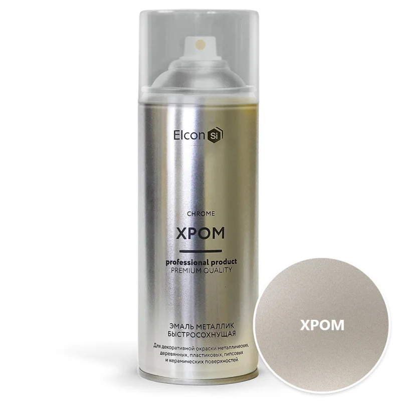Аэрозольная краска Elcon в баллончике для мебели, для декора, для металла, для пластика, для керамики, для стекла, для гипса, быстросохнущая, акриловая хром аэрозоль 520 мл предназначена для декоративной окраски металлических, деревянных, пластиковых, гипсовых и керамических поверхностей.